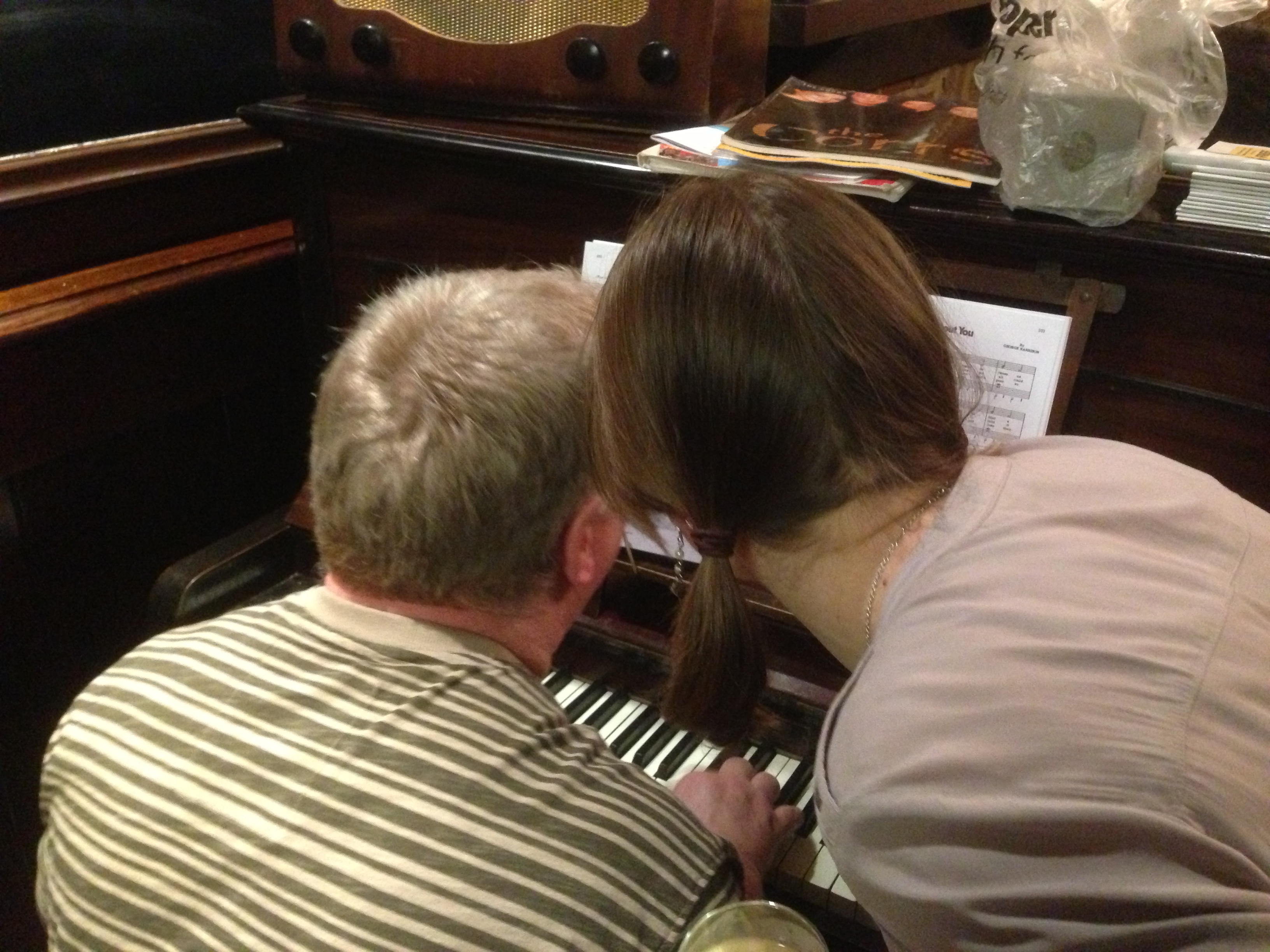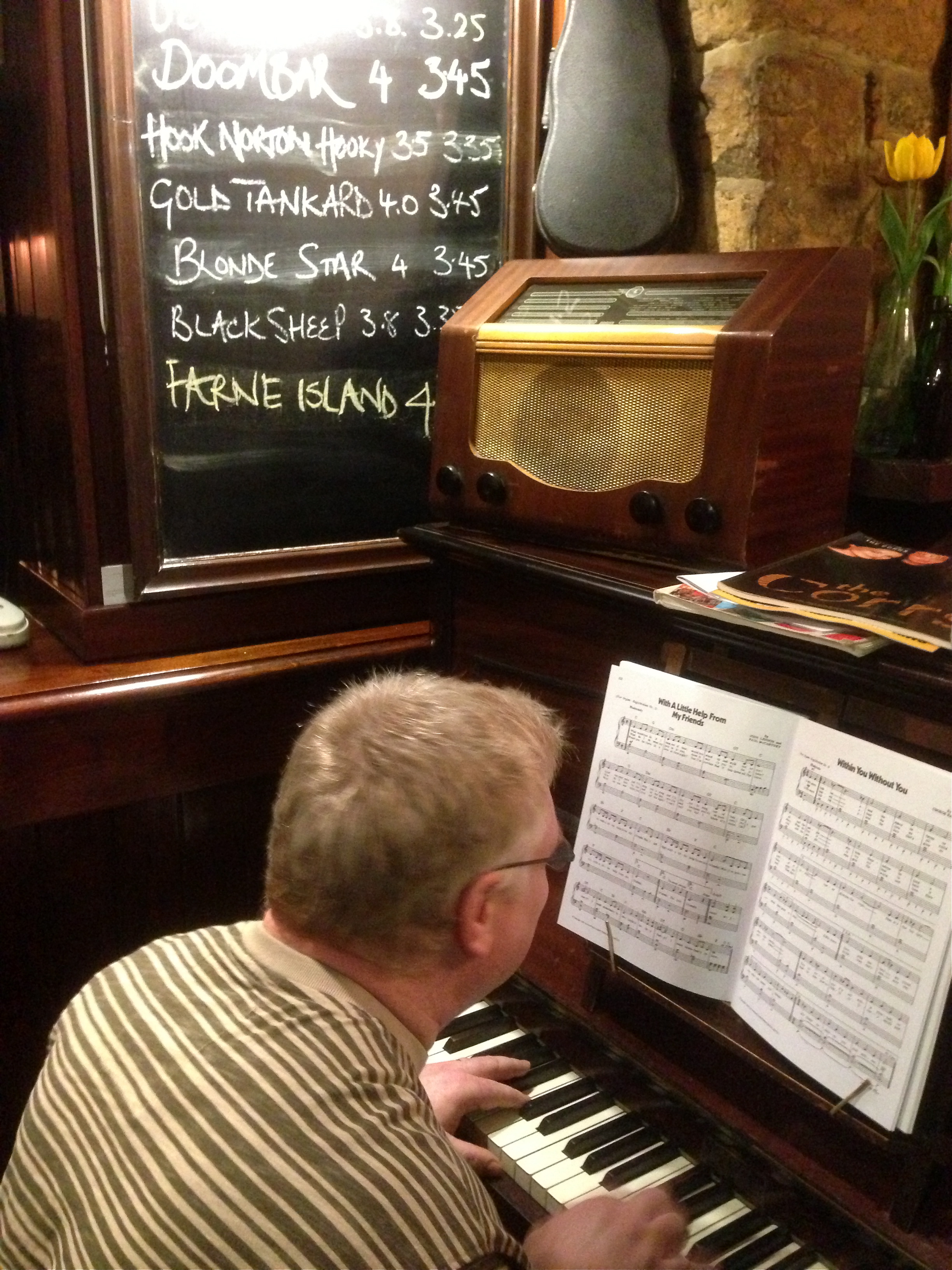 Equipped with the latest technology in visual reading aids Mr Hignett proceeds to entertain the captive audience of the Tap & Spile with a rousing selection of Beatles numbers to critical acclaim. (Very critical)