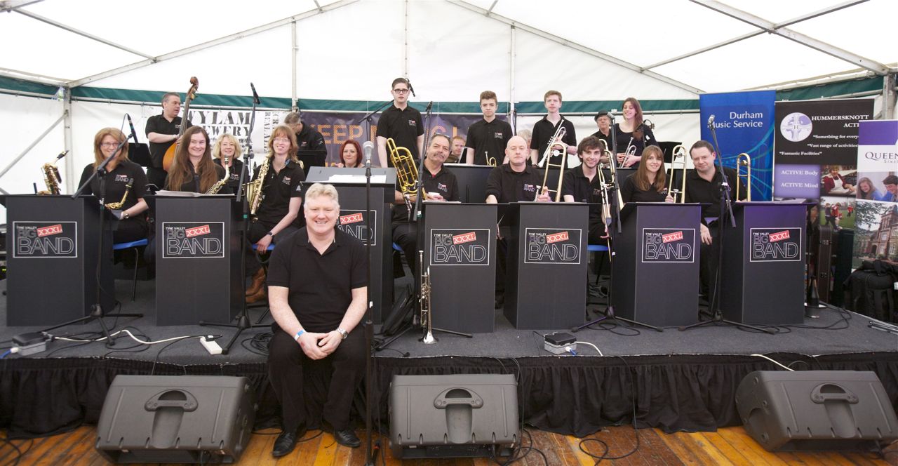 ‘Noon in the marquee. The bar open (White Boar Bitter), the Tyne Valley Big Band, all six million of them, on stage ready to go but not before Jazz in My Pants marched in to once more give it a blast. Fantastic. Dave Hignett, the TVBB’s MD, has knocked into shape a cracking band in next to no time. Resplendent in band t-shirts and matching music stands (all six million of them) the orchestra presented a programme ranging from Sweet Georgia Brown to Sway and Mack the Knife (featuring vocalist Barbra Hignett) to Sammy Nestico’s Lonely Street (alto solo from Kelly Rose) to the Pink Panther Theme (hear that triangle!). Our expert triangularist marched New Orleans’ style around the marquee, taking the opportunity on the way to order a pint from the bar at the back of the room without missing a beat! At this point it should be noted that the TVBB enjoys a ‘working relationship’ with the Wylam Brewery but on this occasion it was a case of ‘needs must’. Alistair Lord played the high register stuff in the trumpet section, Andrea DeVere took the big tenor parts and singer Barbra Hignett returned to belt out R.E.S.P.E.C.T. Respect to BH! The TVBB left us with a cookin’ Apple Honey (DeVere solo, rhythm section, ensemble). If anyone had been in a Sunday morning stupour they would certainly have been woken up by the Tyne Valley Big Band.’